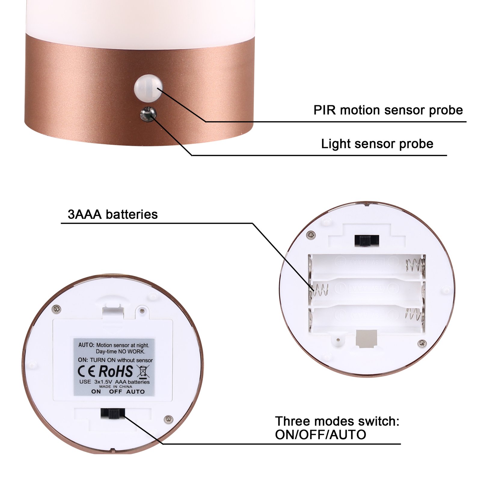 - 【Three modes switch】Auto,night light won’t light up during day time when it is bright enough, on (permanent light, motion sensor off), off.